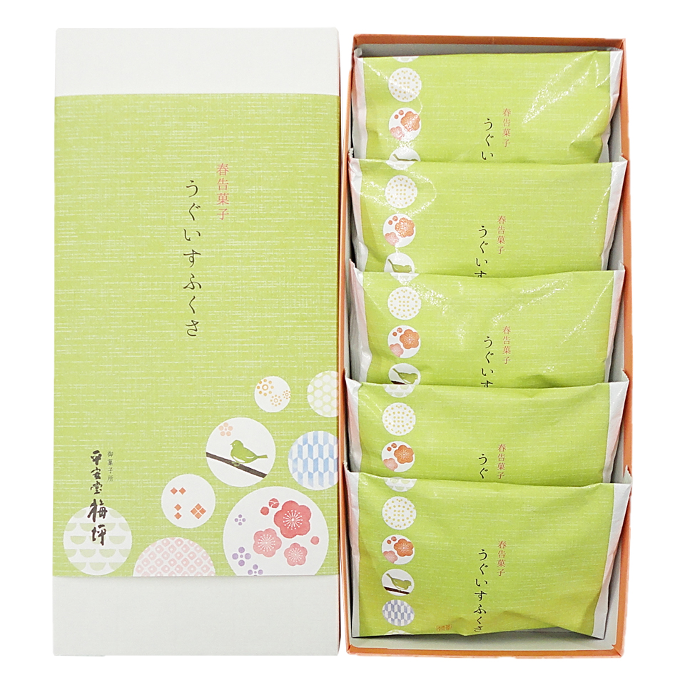 春告菓子 うぐいすふくさ 抹茶風味のふくさ生地で粒あんを包み、 うぐいすの姿に見立てました。 春告鳥の名にちなんだ 風雅な生菓子です。 ※専用の掛紙をお掛けいたします。 注文する Tweet Search for: 価格一覧 1個 249円 5個入 1,458円全て税込価格です。 商品詳細 日保ち 製造日より14日 「日保ち」は目安です。商品もしくは箱の外装に記載の賞味期限、消費期限内にお召し上がりください。 |小麦|卵| 小麦、卵、乳、大豆、山芋、くるみはアレルギー性のある特定原材料、及び特定原材料に準ずるものを表示しております。 注文する 関連記事 小豆の魅力 上品な風味を醸し出す備中白小豆 梅坪のお菓子づくり お菓子を通してこころの豊かさを お菓子の分類 「和菓子の日」の由来 和菓子の材料 人の一生と和菓子